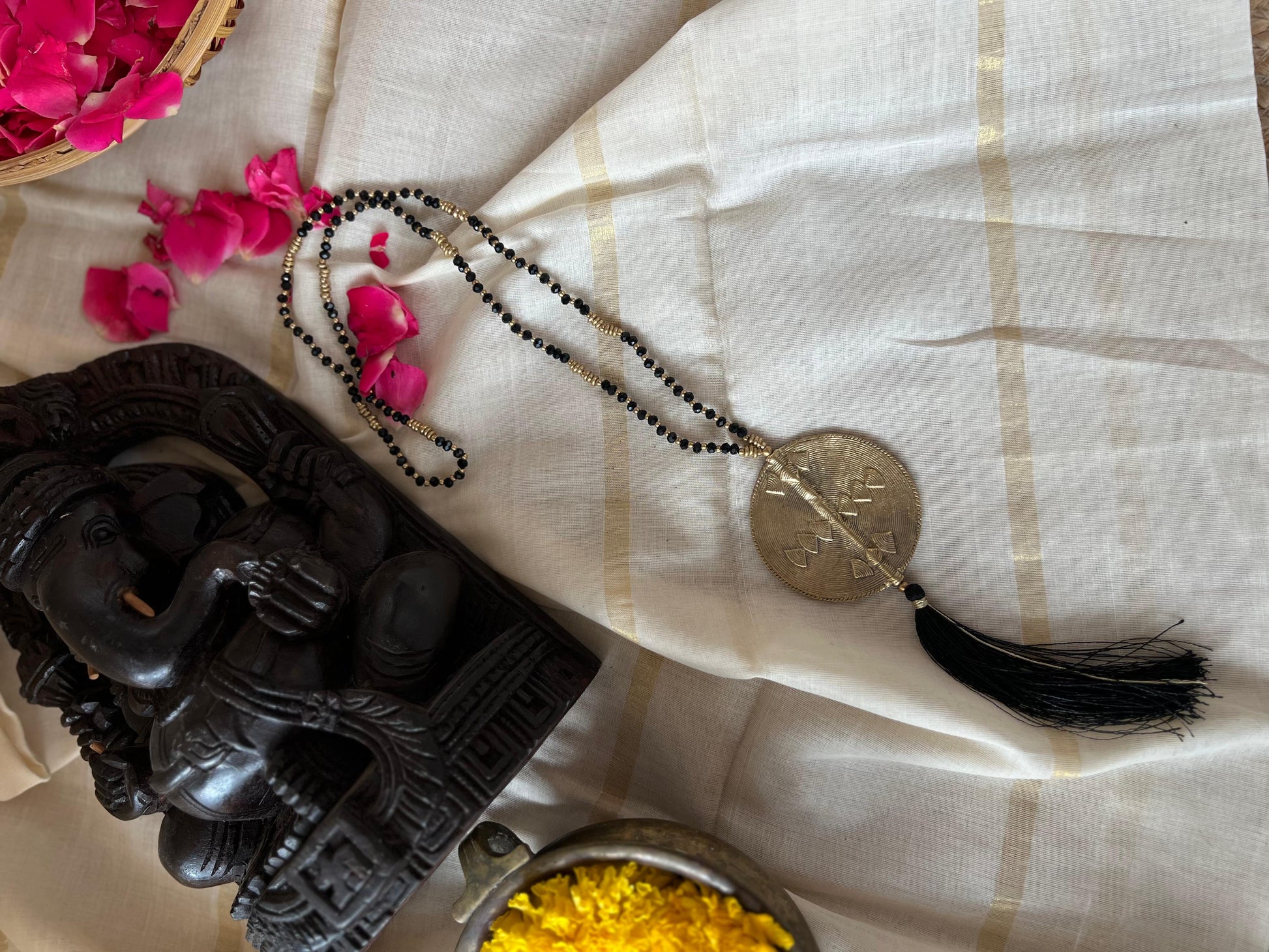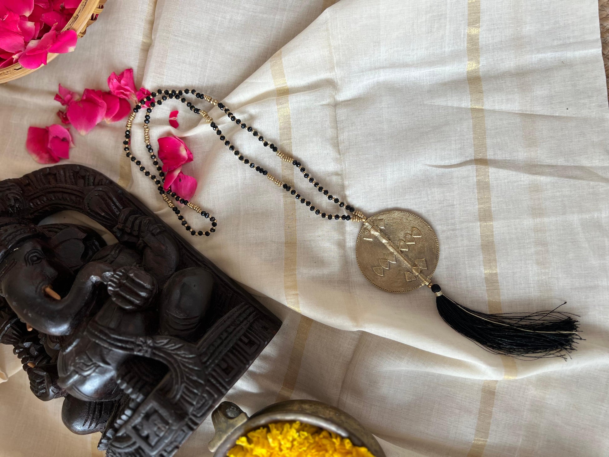 This black long neck piece with tassels features finely woven black threads combined with brass elements, creating a striking contrast. Designed for those who appreciate handcrafted elegance, it adds a bold yet sophisticated statement to any outfit. The lightweight structure ensures comfortable wear, while the tassels enhance movement and visual interest, making it suitable for both casual and formal occasions. This neckpiece exemplifies expert craftsmanship in handloom accessories.