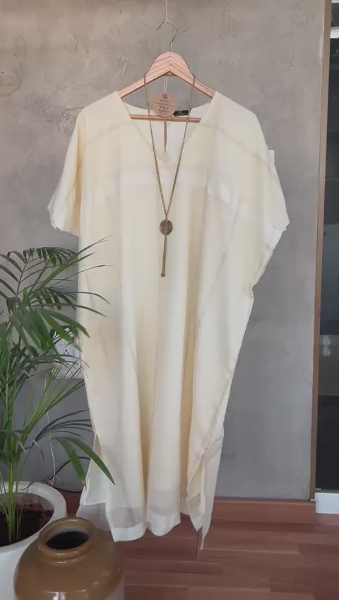 This handloom cotton kaftan features delicate silver lines overlaying a soft, breathable fabric with full lining for comfort and modesty. Ideal for warm climates, its lightweight material ensures effortless elegance while maintaining durability. Perfectly crafted to offer both style and ease, this kaftan is a timeless addition to your wardrobe.