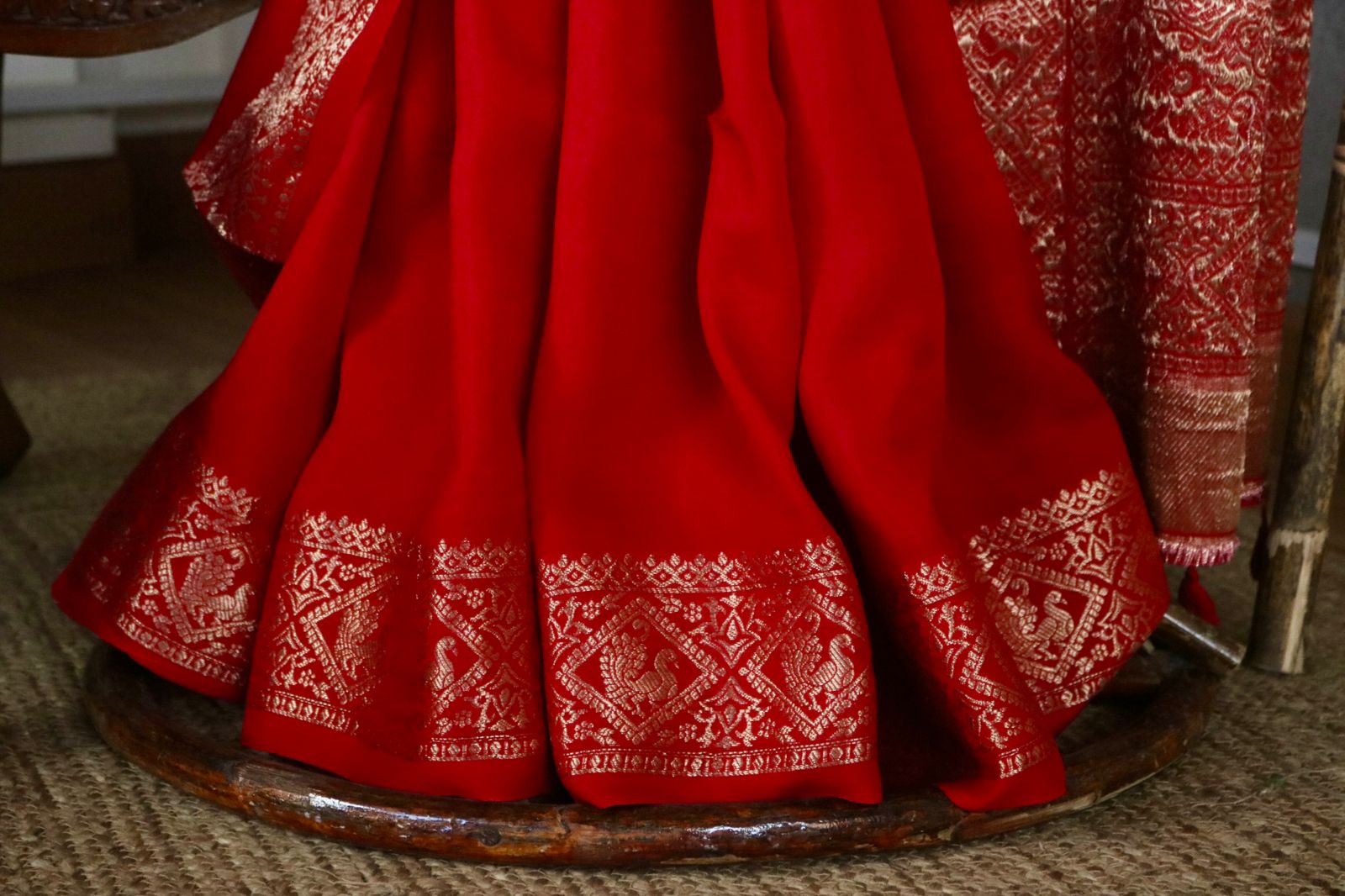 Crafted from premium dola silk, this saree showcases the artistry of hand-dyeing techniques that create richness across the fabric. The lustrous weave of dola silk drapes elegantly, offering a sophisticated silhouette for any occasion. Adorned with intricate zari borders that frame the pallu with traditional craftsmanship, this piece features an exquisite peacock motif that captures the essence of classical Indian textile design. Each saree is a unique creation, reflecting the skill of master weavers and the timeless appeal of handloom traditions. Perfect for celebrations, festivals, or formal gatherings, this saree combines heritage aesthetics with contemporary elegance.