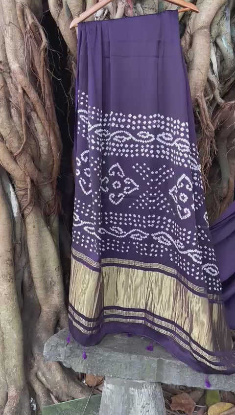 Expertly crafted, this violet saree features a luxurious modal silk fabric adorned with traditional Bandhni patterns on the pallu. The blouse complements the saree perfectly, enhancing its rich texture and vibrant color. Ideal for special occasions, this ensemble blends heritage craftsmanship with contemporary elegance, ensuring a flattering drape and comfortable wear throughout the day.