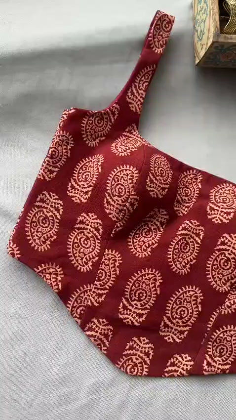 Elevate your ethnic wardrobe with this striking rust corset blouse, a contemporary interpretation of traditional kalamkaari craftsmanship. Featuring hand-painted natural dyes in rich rust tones, this piece showcases the intricate artistry that defines authentic kalamkaari work. The structured corset silhouette provides a flattering, sculpted fit while maintaining the breathable comfort of handloom fabric. Perfect for pairing with traditional sarees or contemporary drapes, this blouse bridges heritage and modern style. Each piece is uniquely crafted, ensuring you own a singular work of wearable art that celebrates India's textile legacy.